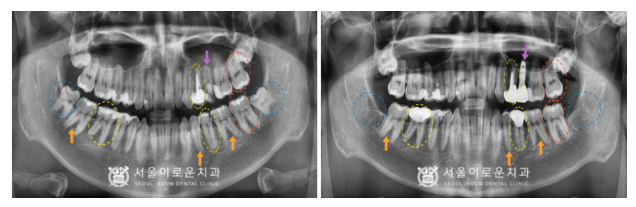 ✔ 왼쪽 위아래 두 번째 큰 어금니(#27,37) – 빨간색 동그라미
