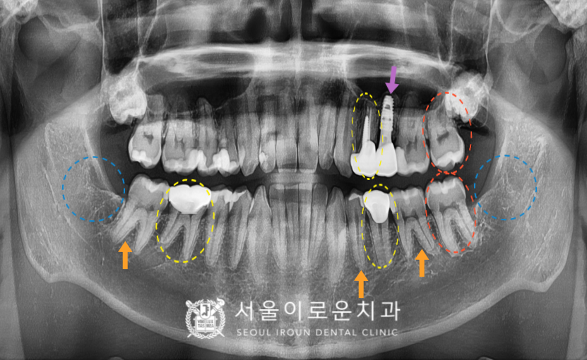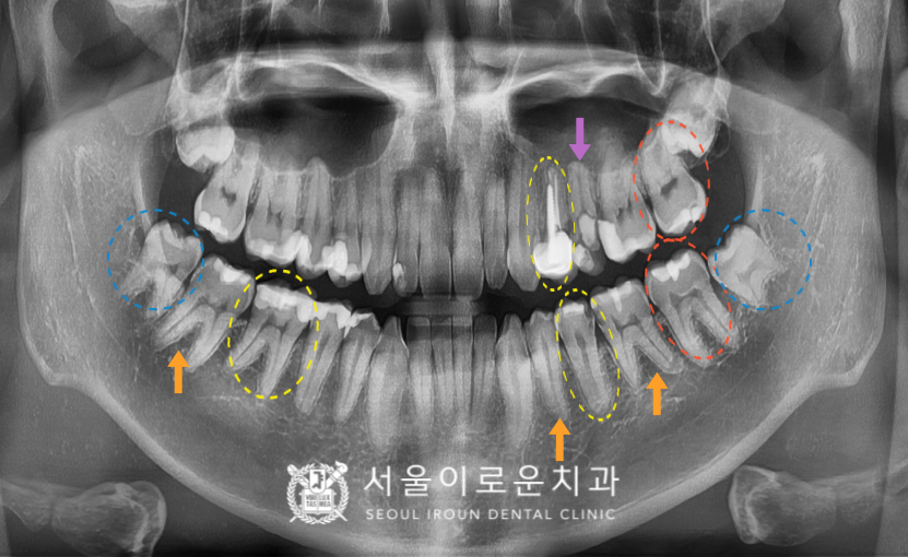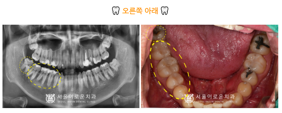 오른쪽 아래 첫 번째 큰 어금니(#46) – 노란색 동그라미
