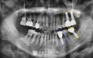 왼쪽 위에 큰 어금니를 보시면 과거 타원에서 신경치료를 했으나